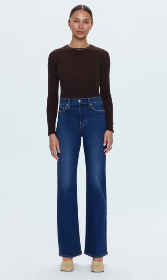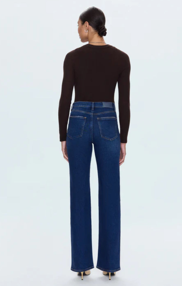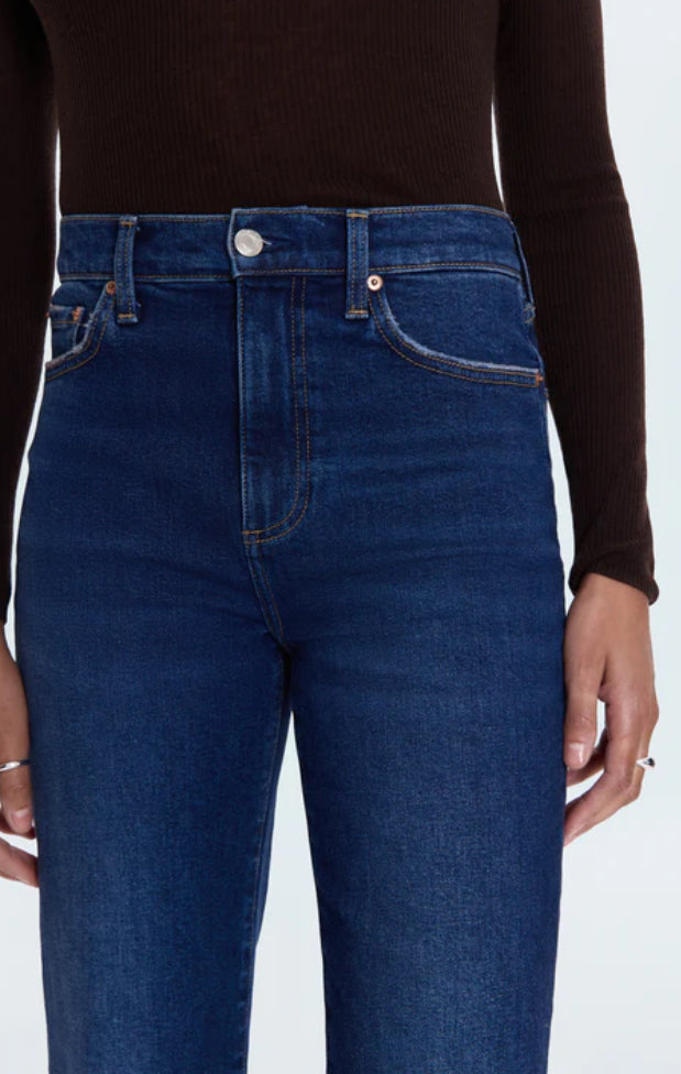 The slim boot that flatters every frame. Evie sits at a high rise with a slim fit through the hips and thighs before opening to a subtle bootcut, creating long, lean lines with just the right amount of flare. The full-length 33" inseam elongates the silhouette, making it endlessly versatile for heels or boots. Crafted from comfort stretch denim in Penthouse, a dark indigo wash with refined fading that adds depth and sophistication.