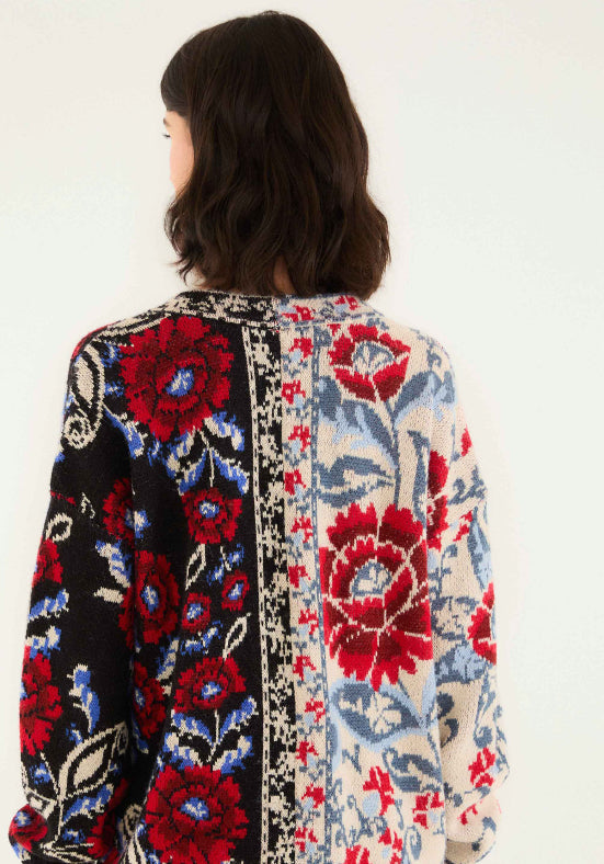 Embrace cozy elegance with the Black Mixed Valentina V Neck Knit Cardigan by FARM Rio. This playful piece features a striking jacquard floral pattern in bold reds, blues, and creams, beautifully divided between light and dark backgrounds. The relaxed silhouette and deep V neckline invite warmth and ease, while intricate borders add a touch of artistry. It’s a vibrant knitwear essential that feels like a gentle hug from the heart of Brazil.