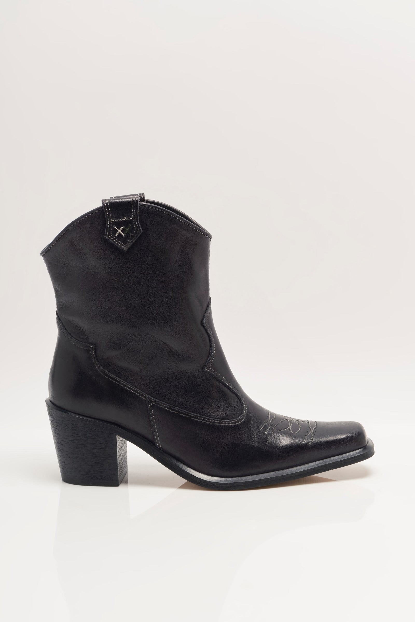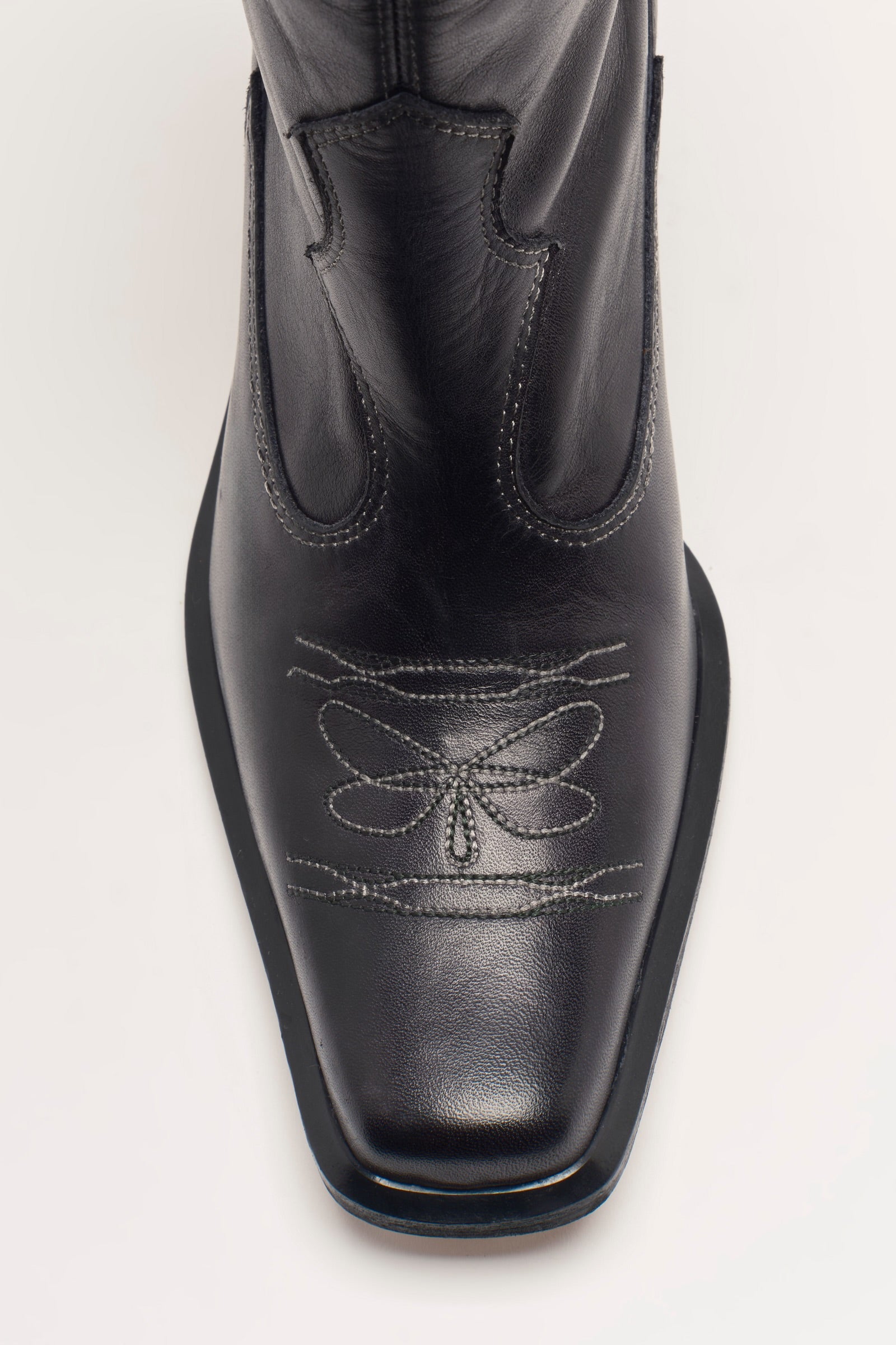 Step into adventure with the Wandering Western Boot in sleek black leather. These ankle-covering boots blend classic western style with a durable leather outsole built for wherever the trail—or the sidewalk—may lead. Perfect for adding a little charm and confidence to any outfit, they bring playful style and lasting comfort to your every step.
