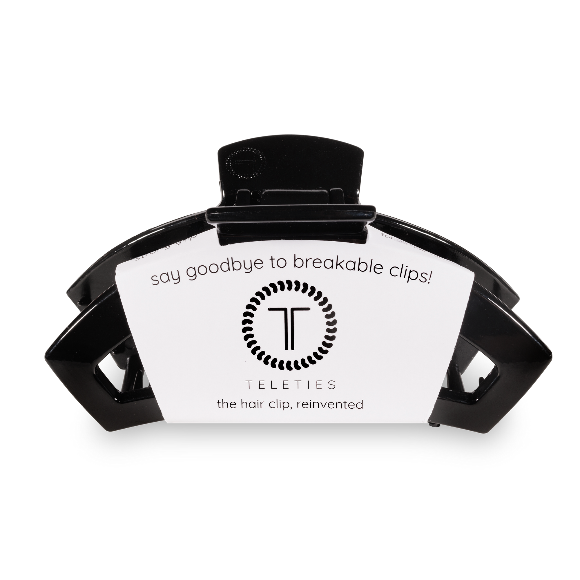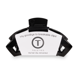 Our Open Hair Clip offers the same incredible advantages as our Classic Claw Clip, but with a unique open-style design that allows your hair to show through. Say goodbye to breakable clips! We have perfected the hair tie and now have re-invented the hair clip. Each clip has bendable teeth that take back to shape, they work on all hair types and have a strong hold. Hold your hair and enhance your style with the new TELETIES Clip!  Large clips are great for thick hair.  The large clip is 4.5 inches long.