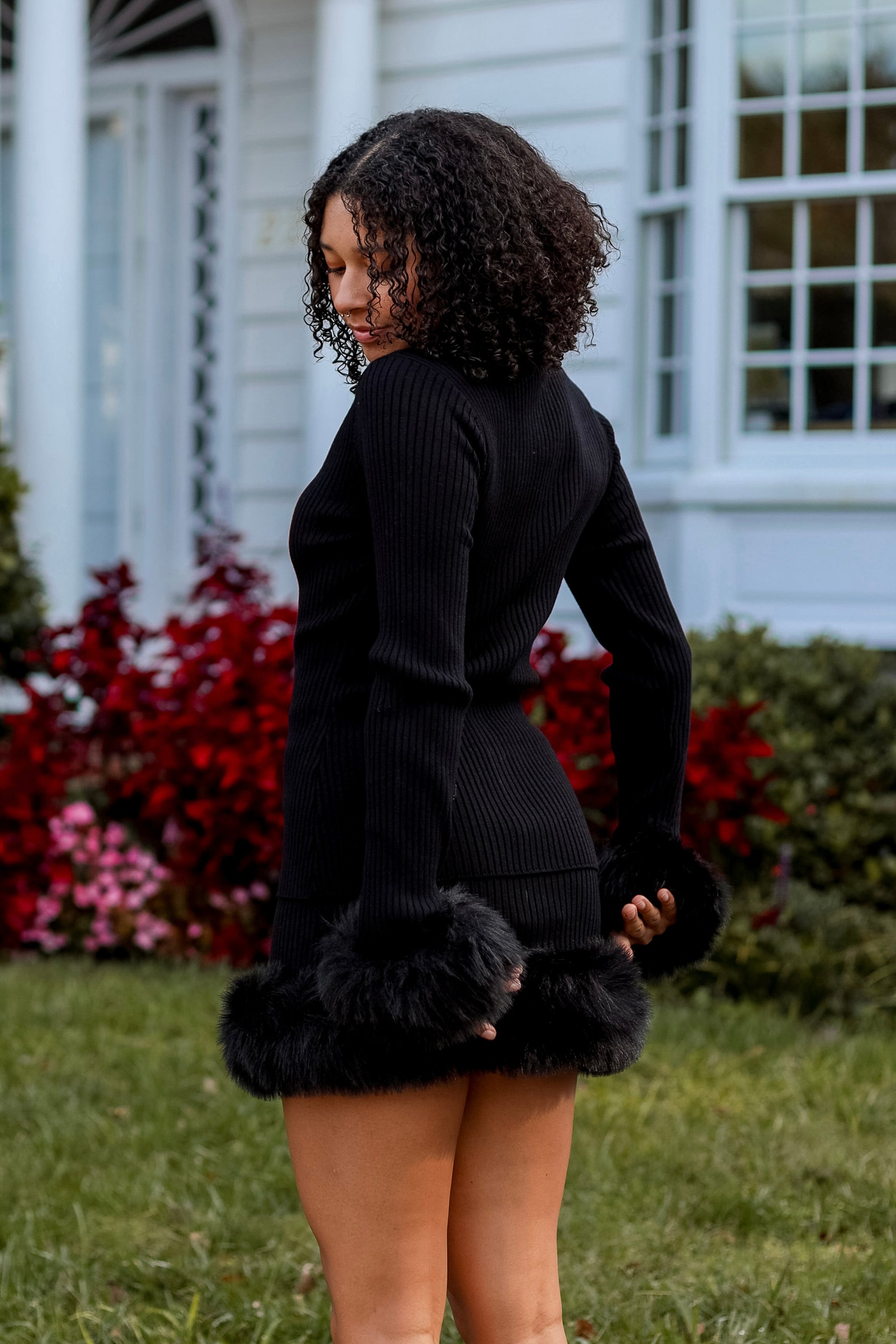 Add a touch of fun to your wardrobe with the Fran Mini Skirt in Black Knit Faux Fur. This unique and quirky skirt will keep you warm and stylish all winter long. Bring out your playful side with the Fran Mini Skirt!