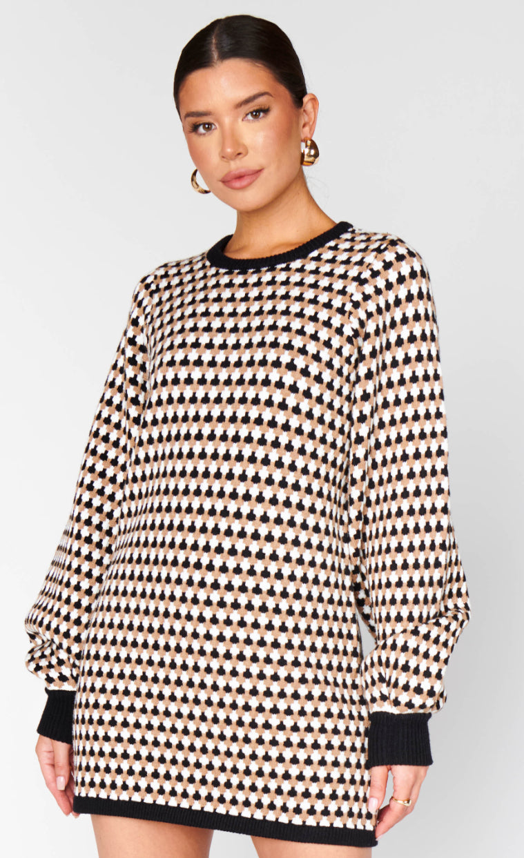 Get ready to slay in the Marion Sweater Dress! Made with a cozy black geo knit, this dress is perfect for any occasion. With its playful pattern and comfortable fit, you'll be turning heads and feeling fabulous all day long. Dress it up or down, this versatile piece is a must-have in your wardrobe