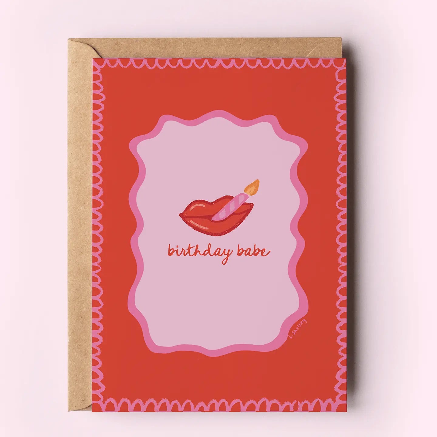 Feed the flames on their birthday with this eye-catching 5x7 birthday card, featuring red lips smoking a lit candle on a pink background and the phrase "birthday babe". The card is blank inside for your own personal message, and comes with a brown kraft envelope.