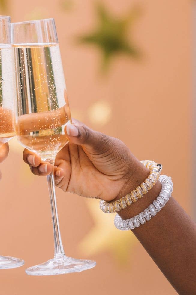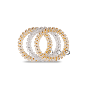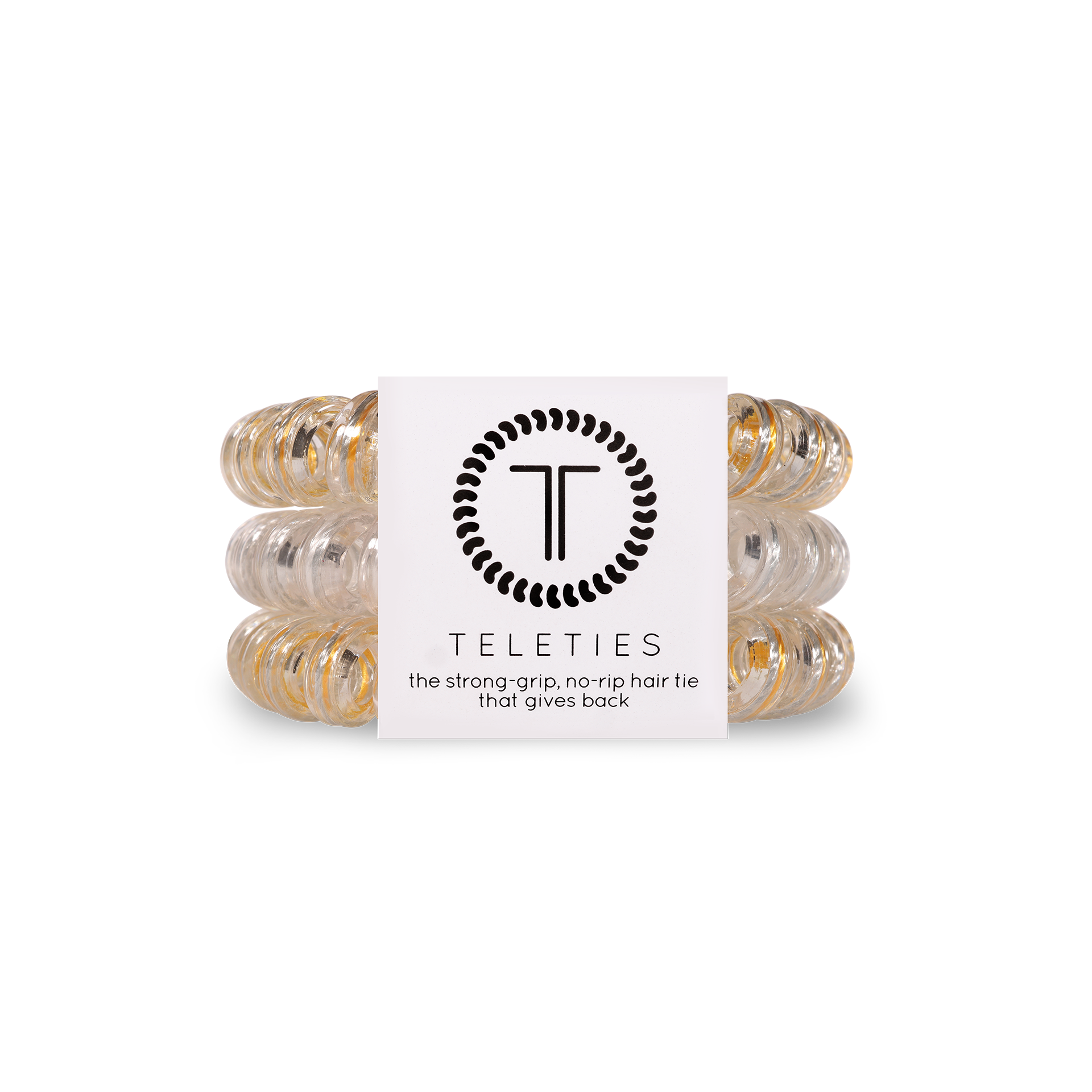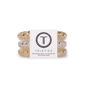 Hold your hair and enhance your style with TELETIES. The strong grip, no rip hair tie that doubles as a bracelet. Strong, pretty and stylish, TELETIES are designed to withstand everyday demands while taking your look to the next level. Sold in packs of three. The large size is 6.5cm wide x 1cm thick.